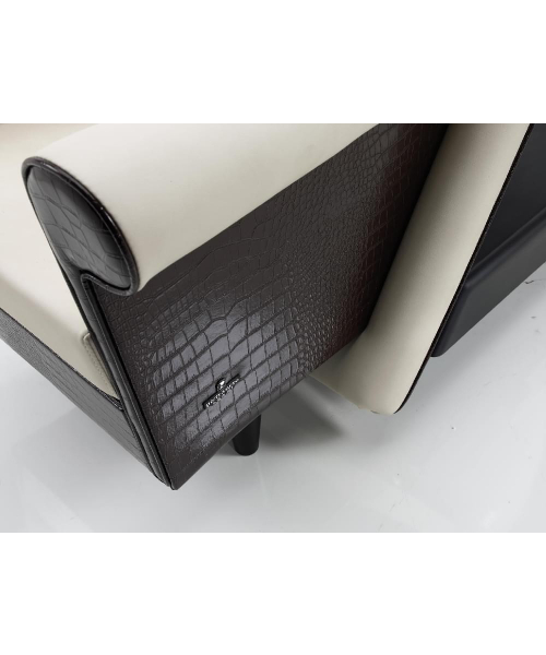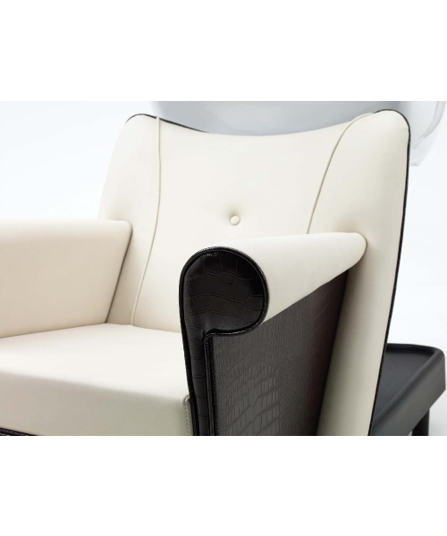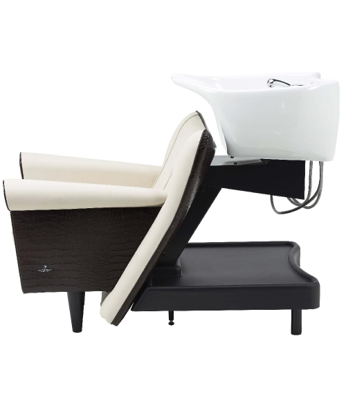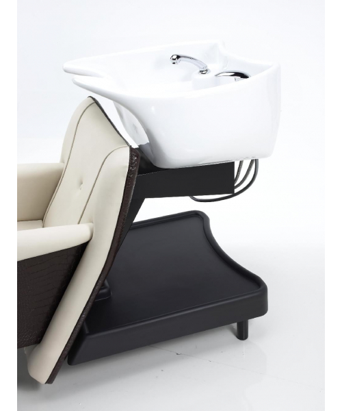 Мойка с креслом на металлическом каркасе черного цвета, сзади пластиковая полка. Комплектуется глубокой керамической раковиной белого или черного цвета, с регулировкой угла наклона, комплектом смесителя с хромированной лейкой душа. Каркас кресла выполнен из металла, мягкие элементы обтянуты искусственной кожей высшего качества, мягкие подлокотники.