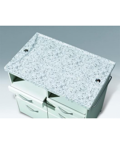 Столешница изготовлена из цельного материала, оформленного под гранит, надежного и стойкого к дезинфекции, легка в уходе и устойчива к воздействию жидкостей.